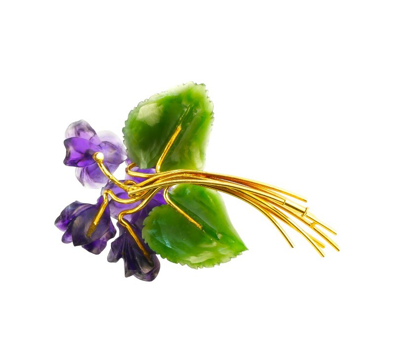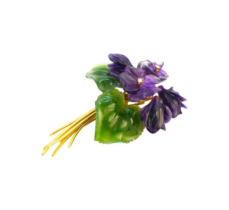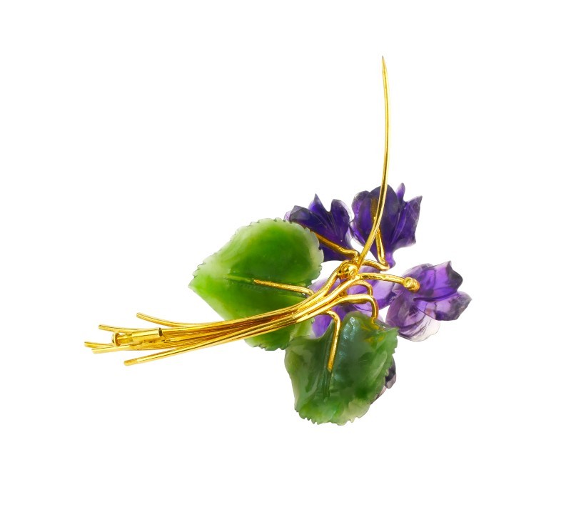Fialky - brož ze žlutého zlata ryzosti 585/1000, kvítka jsou řezána z ametystu, listy z nefritu, dva drobné briliantky. Rozměry brož cca 8,2 x 5 cm, celková hmotnost 29,09 g.