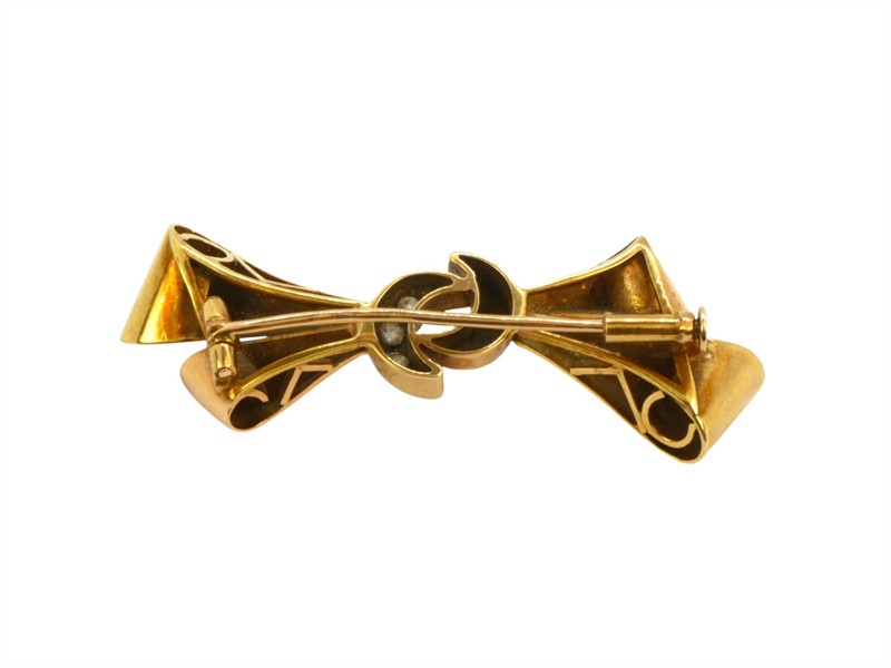 Zlatá brož ve tvaru mašle, zdobená drobnými brilianty. Zlato ryzosti 585/1000 s puncem lvíček. Celková hmotnost brože je 7,27 gramů. Rozměry 4,8 x 1,5 cm.