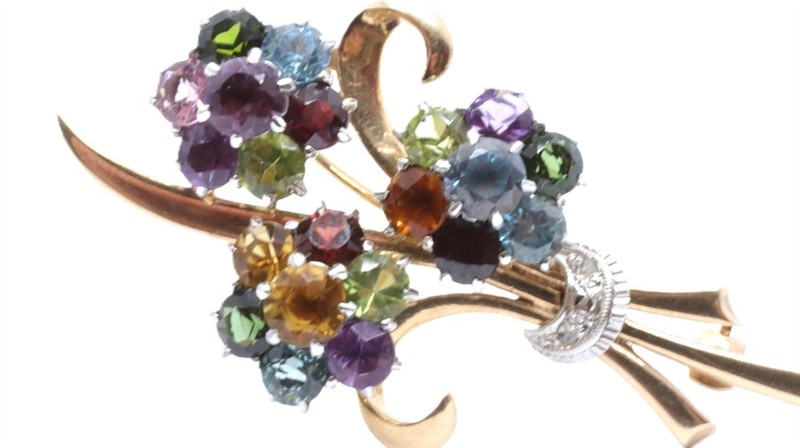 Zlatá brož s diamanty a přírodními kameny. Žluté a bílé zlato 375/1000. Přírodní diamanty, kvalita SI2, barva I - J, celková váha 0,02 ct. Přírodní ametysty, celková váha 1,2 ct. Přírodní citríny, celková váha 0,95 ct. Přírodní granáty, celková váha 1 ct. Přírodní peridoty, celková váha 1,5 ct. Přírodní topazy, celková váha 1,2 ct. Velikost brože: 5,5 cm x 3,5 cm. Váha brože: 11,97 g.