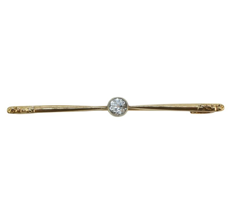 Jednoduchá, elegantní zlatá brož zdobená středovým leukosafírem, zlato ryzost 585/1000, délka 5,2 cm. Hmotnost brože 3,37 g.
