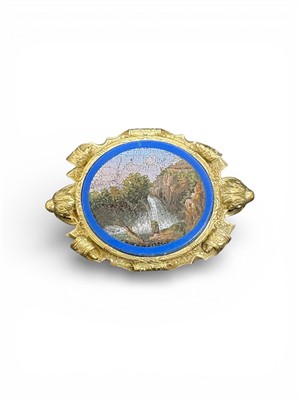 Zlatá brož zdobená krajinným výjevem ve formě drobné mozaiky. Zlato Au 550/1000 v kombinaci se stříbrem Ag 800/1000. Ze stříbra je vnitřní rámeček. K dispozici osvědčení z puncovního úřadu. Hmotnost: 20,00 g. Čechy, 2. polovina 19. století. Velikost: 5,5 x 3,5 cm.