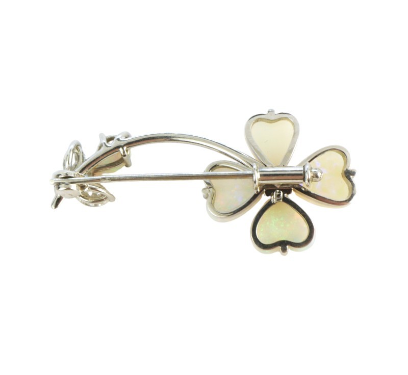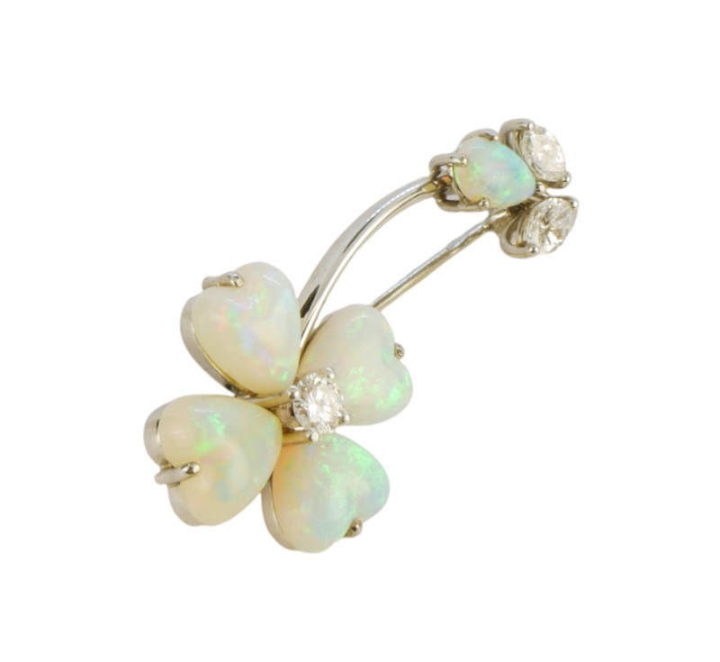 Brož vyrobená z bílého zlata ryzosti 750/1000 zdobená pěti velkými opály a třemi brilianty. Rozměry 3,5 x 1,6 cm. Celková hmotnost 4,66 g.