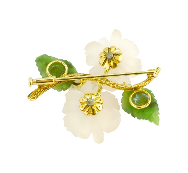 Brož ze zlata ryzosti 585/1000, květy vyřezány z horského křišťálu, lístky z nefritu. V květech drobné briliantiky. Rozměry 5 x 4 cm, celková hmotnost 11,82 g.