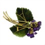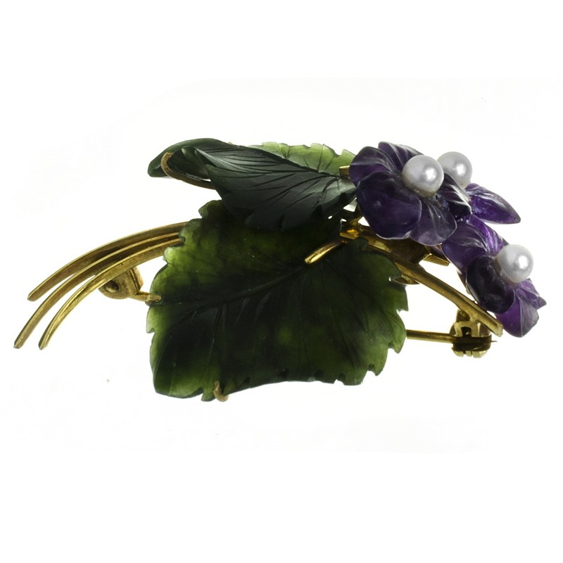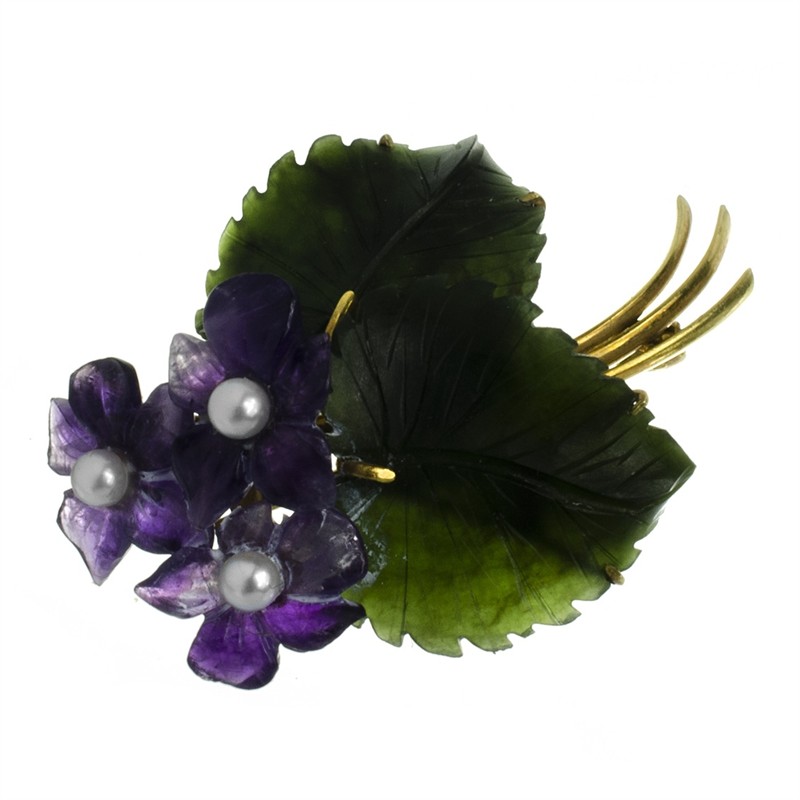 Zlatá brož ve tvaru fialky zdobená vyřezávaným nefritem a ametystem s perličkami. Žluté zlato Au 585/1000, hmotnost: 9,30g. Čechy, 30. léta 20. století. Rozměr: 4x 3 cm.