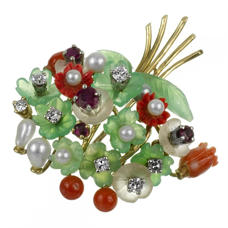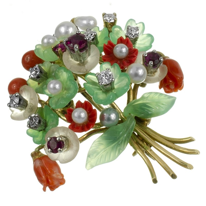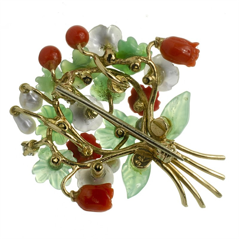 Zlatá brož ve tvaru pugetu květin vyřezávaná a zdobená z různých druhů kamenů - nefrit, korál, perly, křišťál, spinel. Žluté zlato kombinace Au 585/1000 a Au 750/1000, hmotnost: 7,35 g. K dispozici osvědčení z puncovního úřadu. Čechy, 3o. léta 20. století. Rozměry: 6,5 x 5 cm.