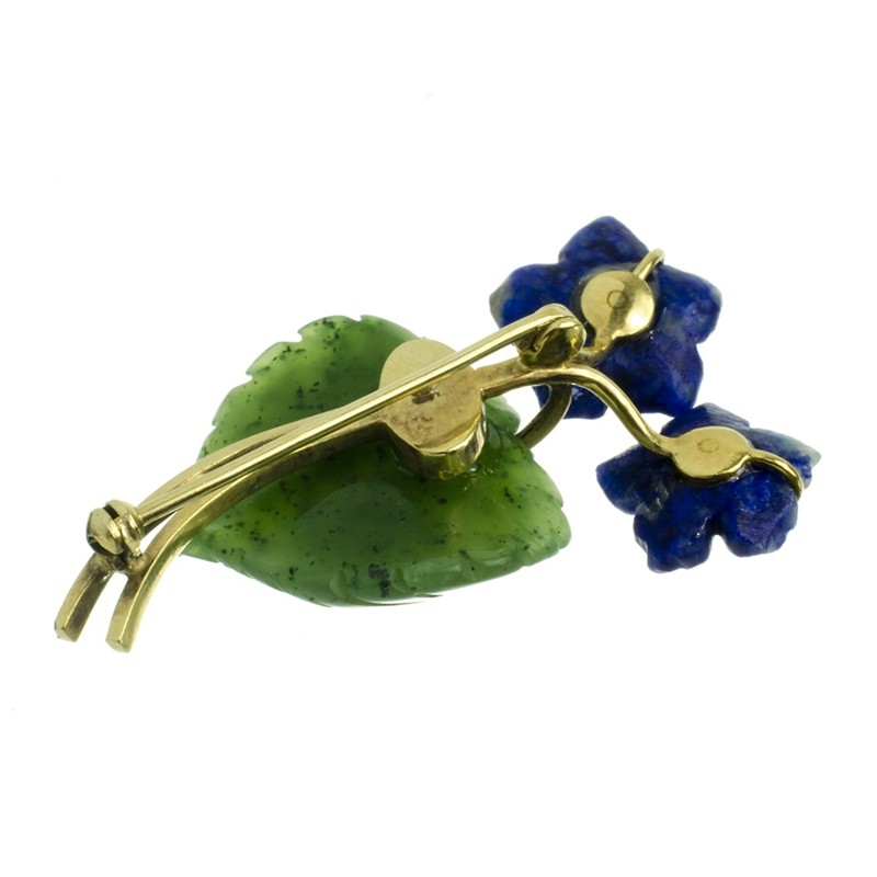 Brož ze žlutého zlata zdobená vyřezávanými drahými kameny (lapis lazuli nefrit, perličky) ve tvaru květiny. Au 585/1000, 7,65g. Čechy, 30.léta 20. století. Délka: 4 cm, šířka: 2,5 cm