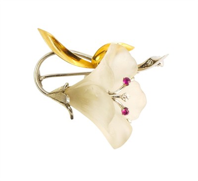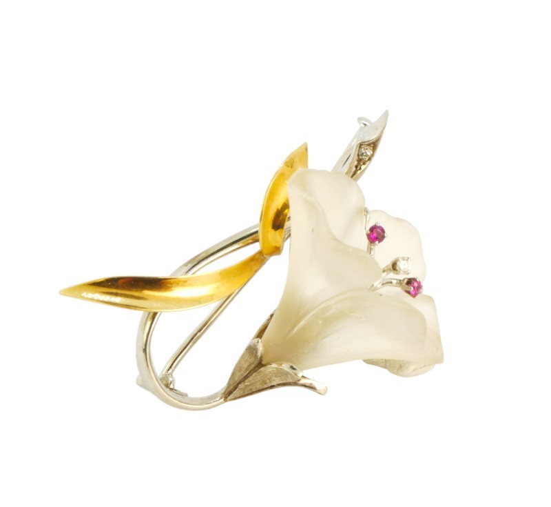 Brož ze žlutého a bílého zlata ve tvaru květiny. Kalich květu vyřezán z horského křišťálu, pestíky doplněny drobnými rubíny a brilianty. Zlato ryzost 585/1000, hmotnost: 10,55 g. Rozměry: 4 x 3 cm.