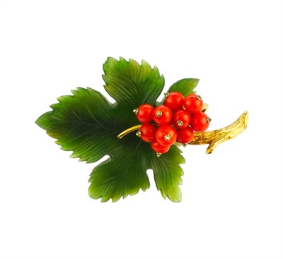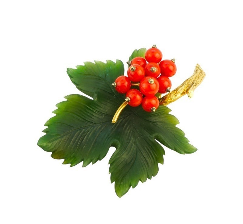 Nevšední brož - rybíz. Šperk byl zhotoven ze zlata 585/1000. Listy ručně vyřezány z nefritu, plody červené korály. Velmi jemná, detailní zlatnická práce. Celková hmotnost šperku 16,64 g. Rozměry 6,8 x 4,5 cm. Perfektní, sbírkový stav.