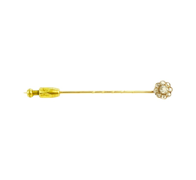 Jehlice vyrobená ze zlata ryzosti 585/1000 (punc liška) zdobená diamanty starého briliantového brusu o celkové hmotnosti zhruba 0,50 ct. Jezdec je zhotoven z obecného kovu. Délka 7,2 cm. Celková hmotnost 3,60 g (2,25 g Au).
