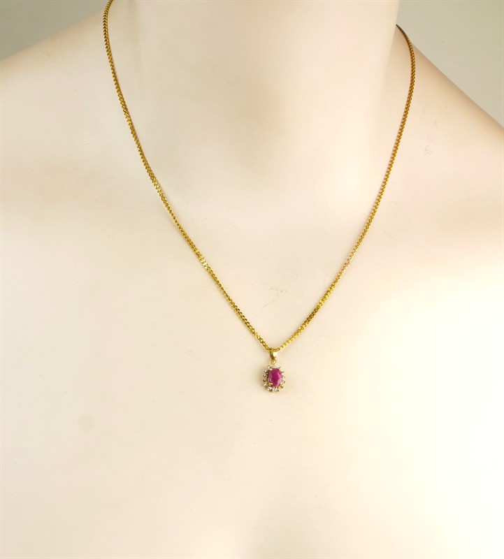 Náhrdelník ze zlata ryzosti 333/1000 zdobený broušeným rubínem a diamanty briliantového brusu. Celková hmotnost 3,00 g. Délka řetízku 44 cm. Rozměr přívěsku i se závěsným ouškem 1,5 x 0,8 cm.