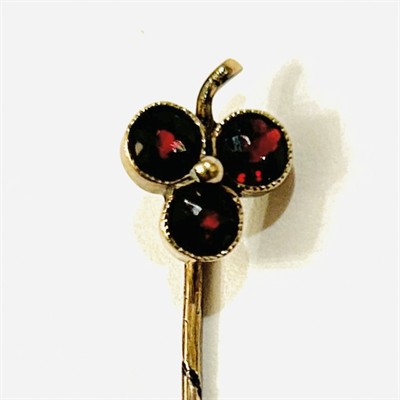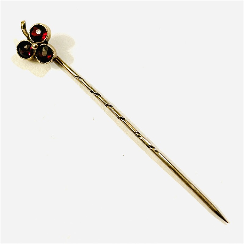 Decentní jehlice s hlavicí ve tvaru trojlístku se stonkem, osazeno 3 českými granáty kulatého brusu, ve středu doplněno granulovanou kuličkou. Variabilně nositelný šperk do kravaty/šátku či klopy, tuzemská zlatnická práce z počátku 20. století. Zhotoveno z narůžovělého 3,8 karátového zlata, tj. o ryzosti 160/1000; neznačeno. Hmotnost 1,09 g, celková délka 60 mm, délka hlavice 11 mm, šířka 9 mm. Ponecháno s přirozenou patinou, lze vyčistit, celkově ve velmi zachovalém stavu.