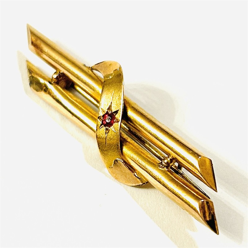 Elegantní brož ve stylu pozdního biedermeieru, tělo složeno z dvou souběžných zkosených dříků, spojenou ladně vinutou páskou osazenou rubínovým kamenem fasovaném v hvězdicovém lůžku. Kontrastní plochy leštěného kovu a potažení matným dukátovým zlatem. Britská (Birmingham) zlatnická práce z poslední čtvrtiny 19. století. Zhotoveno z narůžovělého žlutého 9 karátového zlata, tj. o ryzosti 375/1000, jehla z obecného kovu; britské puncovní značení, ryzostní číslo a značka výrobce "BA&Co." zespoda. Hmotnost 2,63 g, celková délka 50,5 mm, šířka 15,5 mm. V jednom bodě brož poškozena a opravována letováním, tělo lehce prohnuté (není při nošení patrné), zohledněno v ceně.