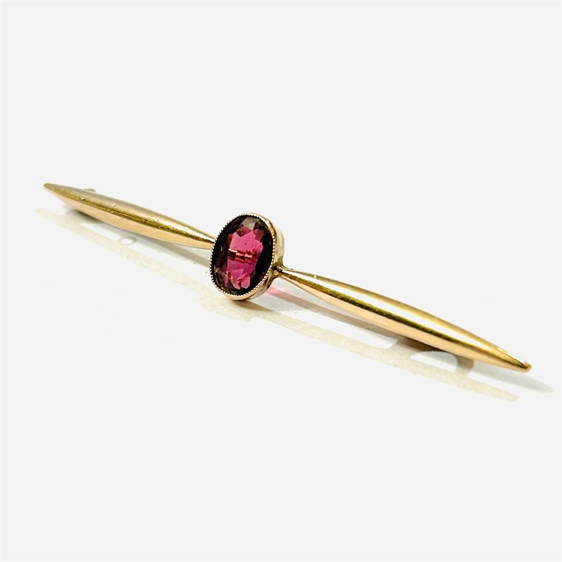 Decentní, elegantní podlouhlá brož z období secese, dynamicky tvarovaná ramena uprostřed osazeny v zrnité obrubě přírodním almandinem (se silným fialovým nádechem) oválného brusu. Kvalitní západoevropská zlatnická práce z první pětiny 20. století. Zhotoveno z narůžovělého žlutého zlata, zapínací spona z 18 karátového, tj. o ryzosti 750/1000, tělo z 9 karátového, tj. o ryzosti 375/1000; nově opatřeno puncem Z-59 (písmeno Z s alchymistickou růží) a ryzostní číslo zespod. Hmotnost 3,19 g, délka 56 mm, šířka 8 mm. Zapínání na nepůvodní špendlíkovou sponu v pořádku, celkově v zachovalém stavu.