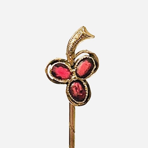 Decentní, secesní jehlice do kravaty či klopy, hlavice ve tvaru trojlistu osazeno 3 červenými kameny oválného brusu fasovaných v zrnité obrubě, jemně rytý stonek, ve středu doplněno granulovanou kuličkou. Středoevropská zlatnická práce z konce 19. či počátku 20. století. Zhotoveno z narůžovělého žlutého zlata, hlavice ze 14 karátového, tj. o ryzosti 580/1000, jehla ze 13,2 karátového, tj. o ryzosti 550/1000; vyhotoveno osvědčení puncovního úřadu. Hmotnost 1,22 g, celková délka 63 mm, délka hlavice 12,5 mm, šířka 8,5 mm. Kmeny lehce podřené (viditelné pod lupou), celkově v zachovalém stavu.