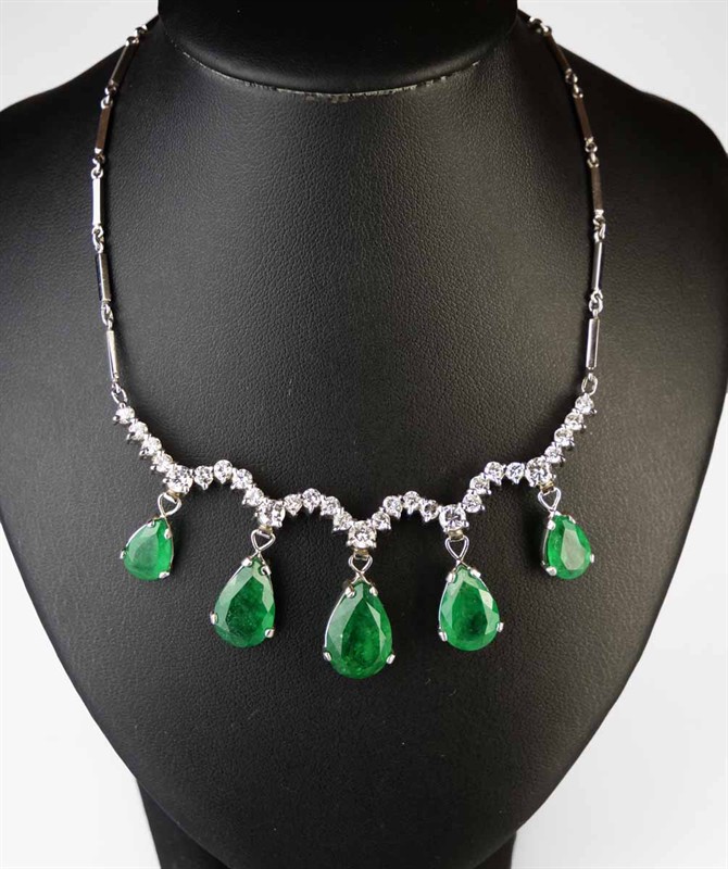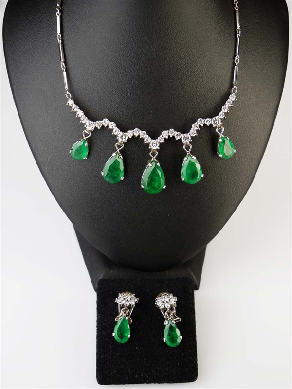 zlaté náušnice a náhrdelník se smaragdy a diamanty, na náhrdelníku je cca 15,5 ct smaragdů kapkového briliantového brusu s velmi malými inkluzemi, dále je na náhrdelníku 29 ks diamantů briliantového brusu o celkové hmotnosti cca 2,71 ct, Au btto 23,23g /450+585/1000, rozměry centrální části náhrdelníku 7,2 x 2,7 x 0,64 cm; na náušnicích je cca 3,9 ct smaragdů briliantového kapkového brusu s velmi malými inkluzemi, dále je na náušnicích cca 1,03 ct diamantů briliantového brusu, Au btto 5,59 g/450+585/1000, rozměry náušnic 2,55/2,64 x 0,98 x1,26 cm, šperkařská práce z přelomu 20. a 21. století; u kolieru i náušnic je pozdější český punc (labuť) a samostatné znalecké posudky