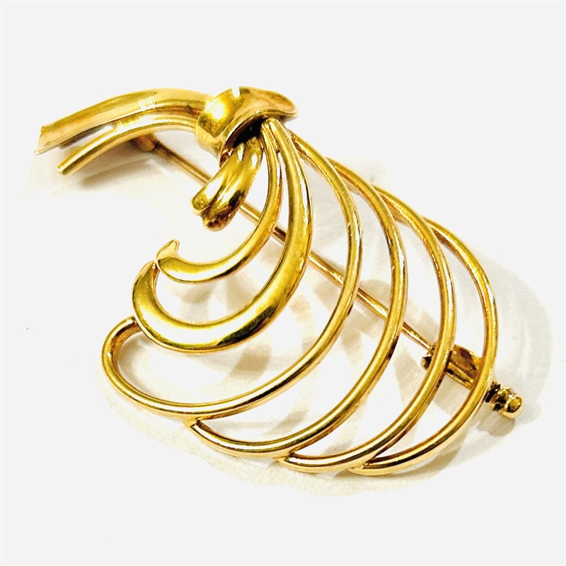 Půvabná brož ve tvaru stylizovaného peříčka, ladně tvarované zesilující křivky. Solidní německá zlatnická práce z 50. až počátku 60. let 20. století. Zhotoveno ze sytě žlutého zlata, tělo a zapínání z 18 karátového, tj. o ryzosti 750/1000, jehla 13,2 karátového zlata, tj. o ryzosti 550/1000; vyhotoveno osvědčení puncovního úřadu, stornované nezvykle užité ryzostní číslo pro stříbro. Hmotnost 8,68 g, délka 49 mm, šířka 29 mm. Zapínání v pořádku včetně trombónové pojistky, celkově ve velmi zachovalém stavu.