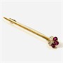 Elegantní podlouhlá brož, na konci rozšiřujícího se těla hlavice v podobě pětilistého květu, osazeno 3 přírodními diamanty starého briliantového brusu o celkové váze cca 0,55 ct, kvalita dobrá až střední, dále doplněno 3 přírodními rubín starého obdélného brusu o celkové váze cca 0,70 ct, velmi dobrá čistota a sytá barva, kameny fasovány v mnohokrapnových korunách. Solidní středoevropská klenotnická práce z přelomu 19. a 20. století. Zhotoveno z narůžovělého žlutého 14 karátového zlata, tj. o ryzosti 585/1000; nově opatřeno puncem Z-58 (labuť 4) u pojistky. Hmotnost 7,80 g, délka 76 mm, šířka 11,5 mm. Zapínání v pořádku včetně trombónové pojistky, celkově ve velmi zachovalém stavu.