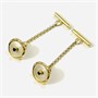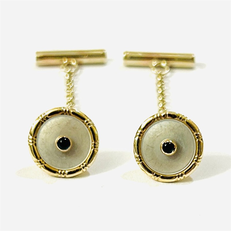 Decentní, drobnější manžetové knoflíčky z období art-deco, hlavice osazeny diskem z přírodní bílé perleti, ve středu kulatou muglí přírodního modrého safíru, rámeček s jemným rytmickým reliéfem. Kvalitní západoevropská zlatnická práce z 20. let 20. století. Zhotoveno ze žlutého 14 karátového zlata, tj. o ryzosti 585/1000; prvorepublikový dovozový punc (lyra s Č) na oušku. Hmotnost 3,29 g, celková délka 32,5 mm, patka 12 mm, průměr hlavice 10 mm. Současně přidaný řetízek s patkou, celkově ve velmi zachovalém stavu, odborně vyčištěno a vyleštěno zlatníkem.