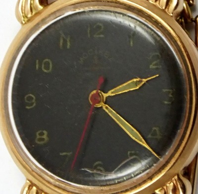 Čtrnáctikarátové zlato. Ryzost Au 583-585/1000, celková hmotnost 50,10 g. Přiloženo osvědčení Puncovního úřadu České republiky. Hodinky Moskva od výrobce: První moskevský hodinářský závod KIROV. Zlatý náramek zhotovený klenotníky v Oděse v Ukrajinské sovětské socialistické republice. Hodinky se zlatým pouzdrem ve stylu art deco. Černý ciferník s luminiscenčními arabskými číslicemi. Zlaté ručičky s červenou vteřinovkou. Ciferník značený MOSKVA v azbuce. Funkční. Vzhledem ke stáří hodinek bez záruky přesnosti chodu a dlouhodobé funkčnosti. Náramek ze žlutého a růžového zlata s reliéfními linkami a prořezávaným ornamentem. Hodinky značené sovětským puncem a značkou výrobce. Sovětský Svaz, Moskva a Oděsa 1950 - 1959. Průměr hodinek 33 mm. Délka řemínku 165 mm, šířka řemínku 15 mm.