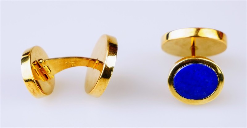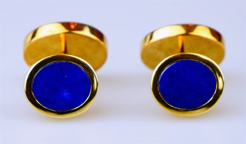 Majestátní masivní dvojité oválné manžetové knoflíky ze žlutého zlata s lapisem lazuli, celková hmotnost 26,90 g, Au 585/1000, český punc, ryzostní číslo a značka výrobce HM v kartuši. 4 x lapis lazuli oválného brusu výborné kvality. Rakousko, poslední třetina 20. století. Velikost přední části knoflíku 19,5 x 17,5 mm, zadní části 16 x 14 mm, délka 25 mm.