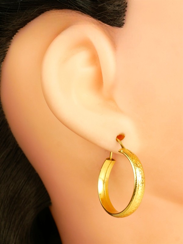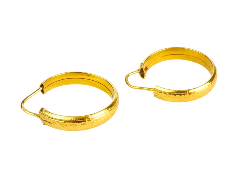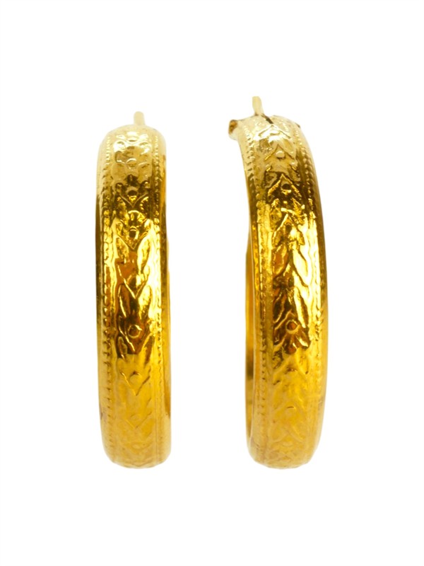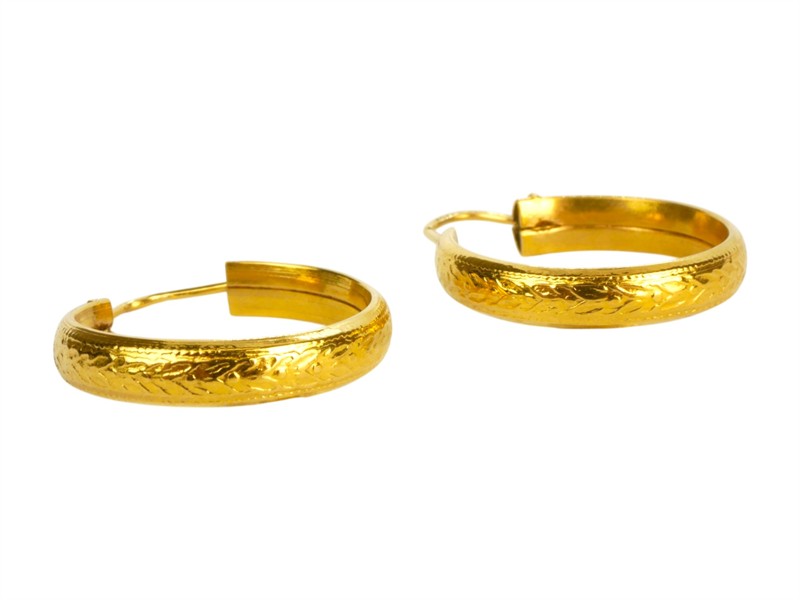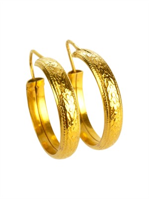Krásné náušnice vyrobené ze zlata ryzosti 750/1000 zdobené jemným gravírováním po celém obvodu. Rozměry 2,7 x 2,3 cm. Celková hmotnost 4,62 g.