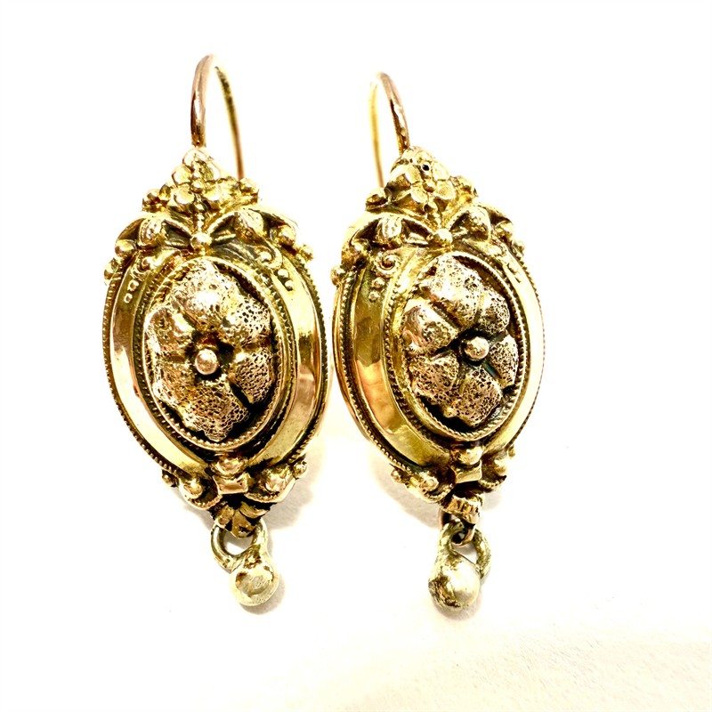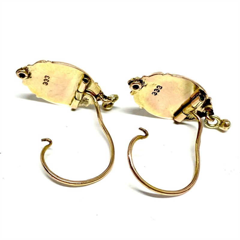 Velmi půvabné, závěsné náušnice zhotovené ze zlata ve stylu biedermeier. Náušnice jsou detailně zdobeny plastickým florálním motivem. Zlato ryzosti 333/1000, celková váha 1,47 g. Délka 2,8 cm. Výborný stav.