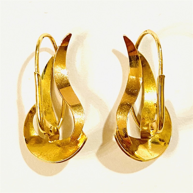Větší náušnice ve tvaru ladně stylizované kapky, místy zdobeno jemným rytím. Kvalitně zpracovaný šperk ze 70. až 80. let 20. století z dílny brněnského klenotnického družstva Karat. Zhotoveno ze žlutého a červeného 14 karátového žlutého zlata, tj. o ryzosti 585/1000; punc Z-36 (čejka 4), ryzostní číslo a mistrovská značka družstva K“ na dřících. Hmotnost 3,30 g, celková délka 25 mm, šířka 13 mm. Zapínání formou klapky, které je v pořádku, celkově ve velmi zachovalém stavu.