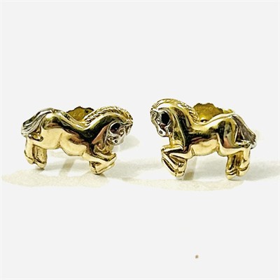 Decentní, drobnější náušnice s plastickými hlavicemi ve tvaru koně ve skoku, hlava a žíně potaženy kontrastním stříbřitým rutheniem. Šperk s oblíbenou tematikou, německá šperkařská práce z poslední pětiny 20. století. Vyrobeno technikou perforovaného kovu. Zhotoveno ze žlutého 8 karátového zlata, tj. o ryzosti 333/1000; ryzostní číslo na dřících a zapínání spolu se značkou výrobce. Hmotnost 0,63 g, délka hlavice 11 mm, šířka 8 mm. Zapínání formou puzety, celkově v zachovalém stavu.