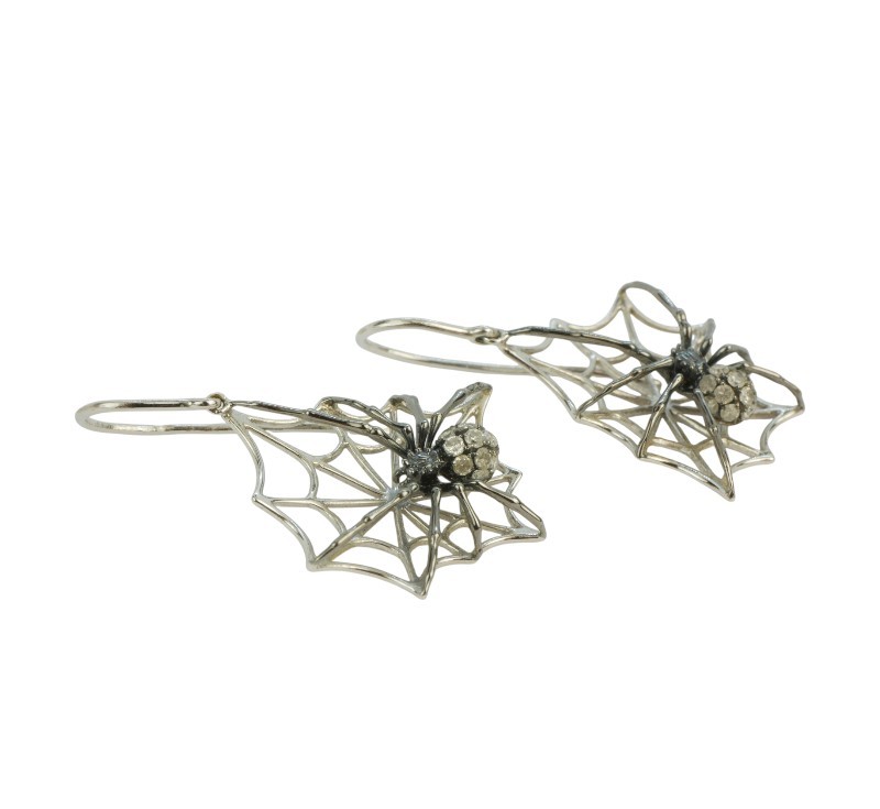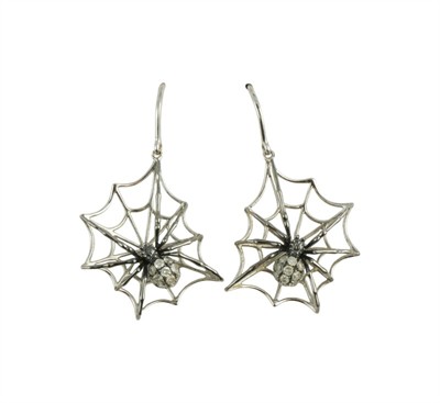 Visací náušnice z bílého zlata ryzosti 750/1000 ve tvaru pavučin s pavoučky, zdobené drobnými brilianty. Rozměry 2,5 x 2,54 cm. Celková hmotnost 3,75 g.