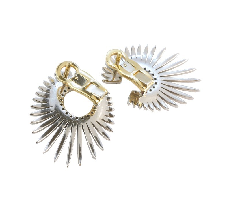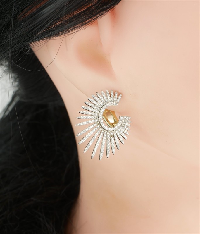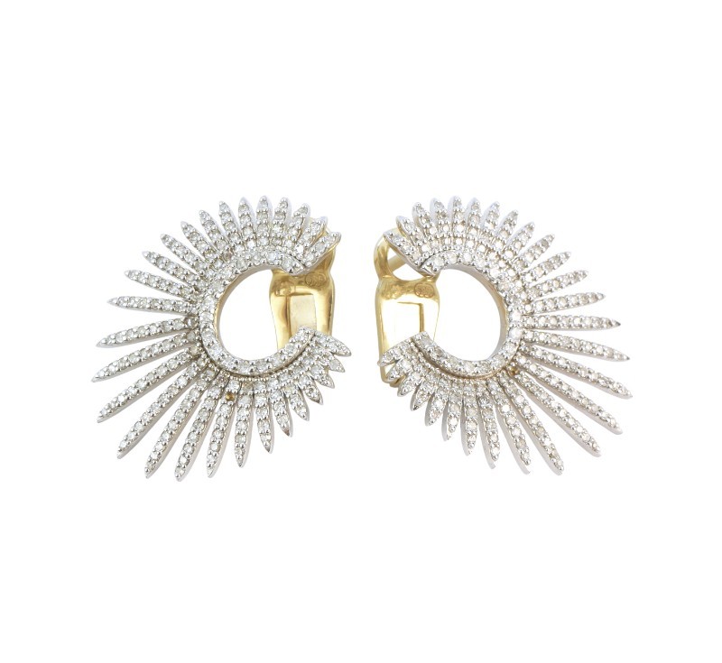 Netradiční náušnice ze zlata ryzosti 585/1000 zdobené diamanty briliantového brusu o celkové hmotnosti 2,5 ct. Rozměry 2,7 x 2,1 cm. Celková hmotnost 8,12 g.
