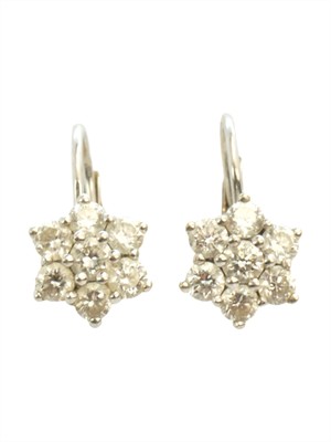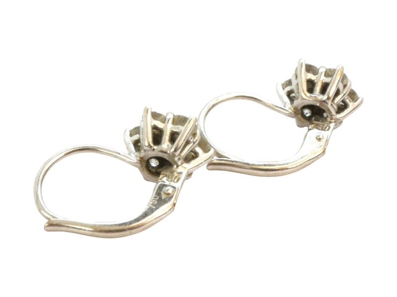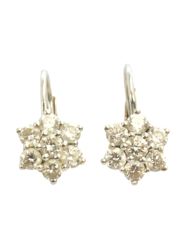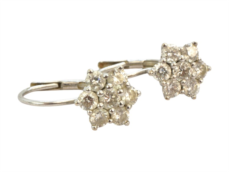 Zlaté náušnice ve tvaru kytiček osázené diamanty briliantového brusu o celkové hmotnosti 0,6 ct. Zlato ryzosti 750/1000. Celková hmotnost náušnic je 2,48 gramů.