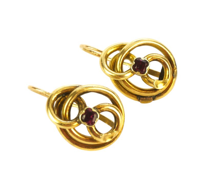 Náušnice ze zlata ryzosti 333/1000 ve tvaru uzlů s červenými kameny. Rozměry 1,7 x 1,5 cm. Celková hmotnost 3,28 g.