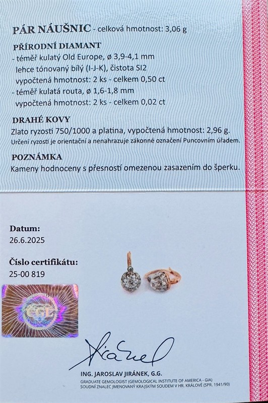 Zlato o ryzosti 750/1000 platina váha 3,05 g výška s ouškem 1,3 cm, průměr hlavy 0,6 cm přírodní diamanty 2 ks 0,50 ct, 2 ks 0,02 ct barva (I-J-K), čistota SI2 výborný stav osvědčení puncovního úřadu certifikát z gemologické laboratoře je součástí šperku Nabízíme kompletní zlatnický servis na nejvyšší úrovni – od úprav velikostí a odborných oprav přes rhodiování, čištění, leštění až po výměnu kamenů a znalecké posudky. Vše přizpůsobíme vašim přáním.
