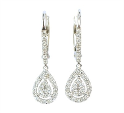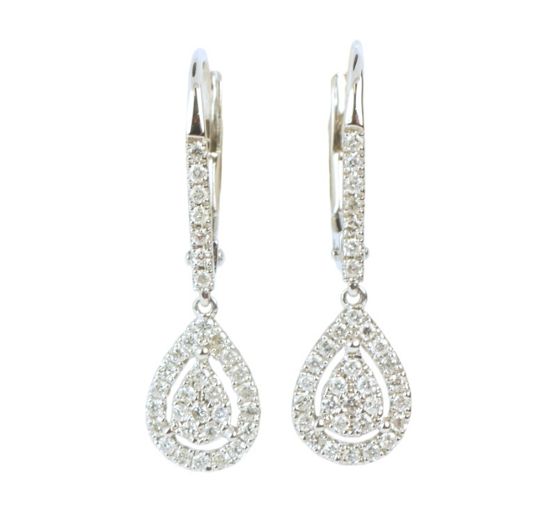 Visací náušnice z bílého zlata ryzosti 585/1000 jsou osazeny diamanty briliantového brusu o celkové hmotnosti 0,33 ct. Celková hmotnost obou náušnic je 1,62 g. Délka náušnice 2,5 cm.