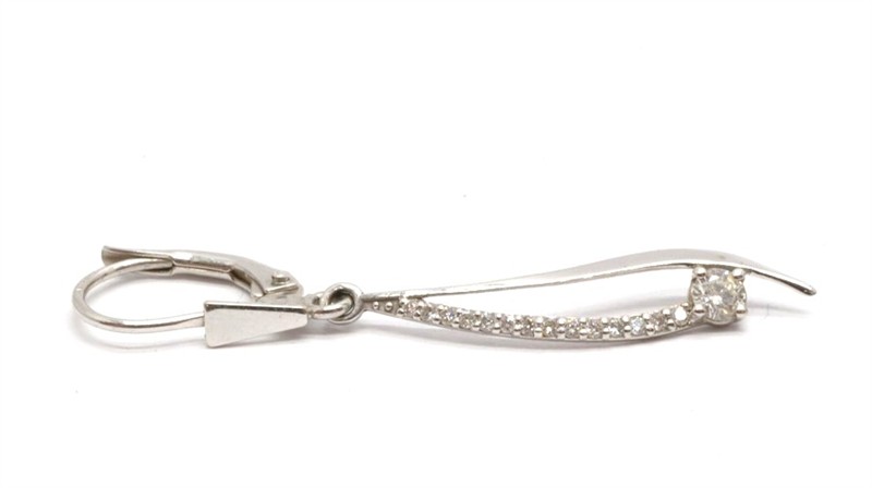 Zlaté náušnice s diamanty. Bílé zlato 585/1000. Přírodní diamanty, kvalita SI1 - SI2, barva H - I, celková váha 0,28 ct. Váha náušnic: 1,85 g. Délka náušnic: 3,2 cm.