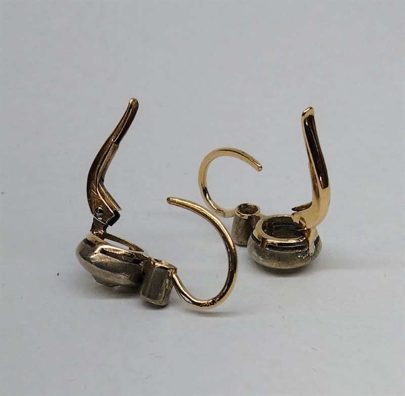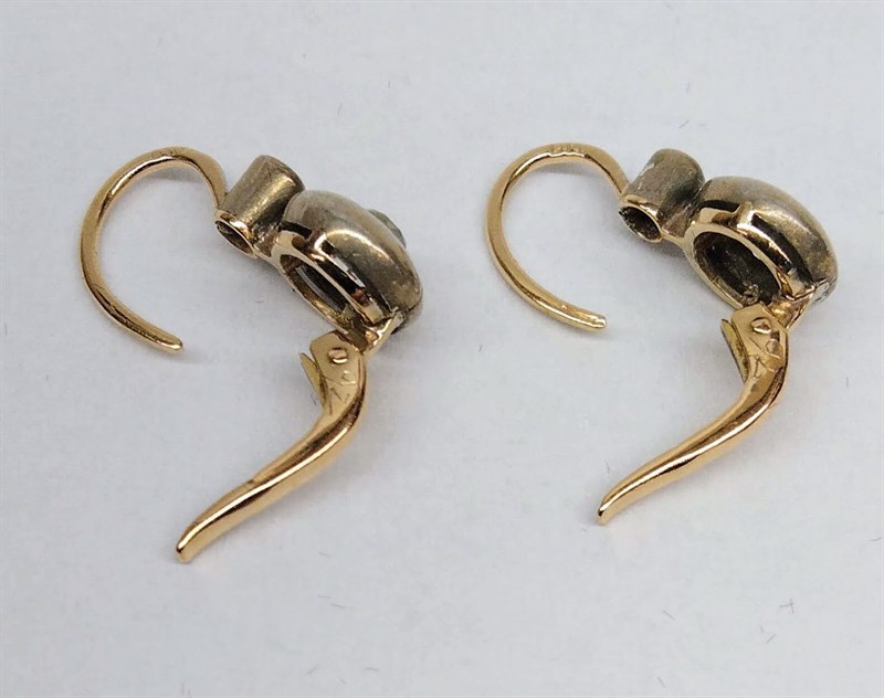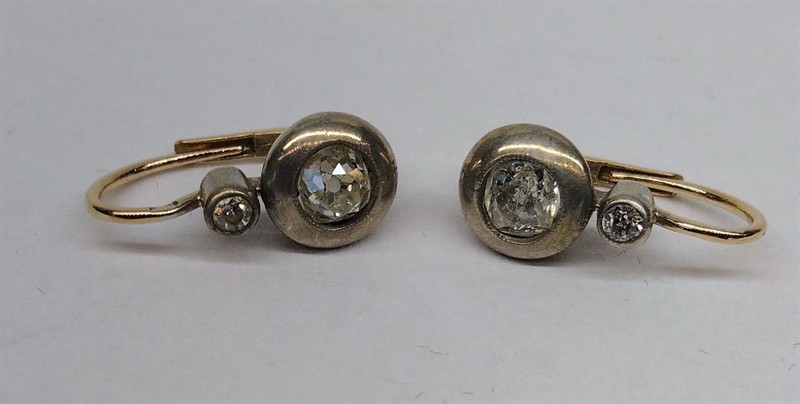Zlaté secesní náušnice, tzv. sněhuláci, s diamanty starého briliantového brusu zasazenými ve stříbře, celkem 0,74 ct. Celková hmotnost 2,95 g, Au 580/1000, punc liška (Z - 27) Budapešť, odborný posudek. Klasické pevné patentní zapínání, velmi dobrý stav. Maďarské království, konec 19. století. Celková délka náušnic s háčkem 1,7 cm, bez háčku 1,1 cm, šířka 0,8 cm.