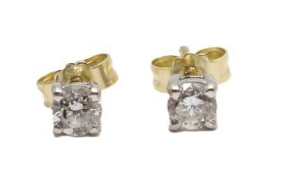 Zlaté náušnice s diamanty. Bílé a žluté zlato 750/1000, puzety žluté zlato 585/1000. Přírodní diamanty, kvalita SI1 - SI2, barva I - J, celková váha 0,32 ct. Váha náušnic: 0,99 g. Průměr náušnic: 0,4 cm.