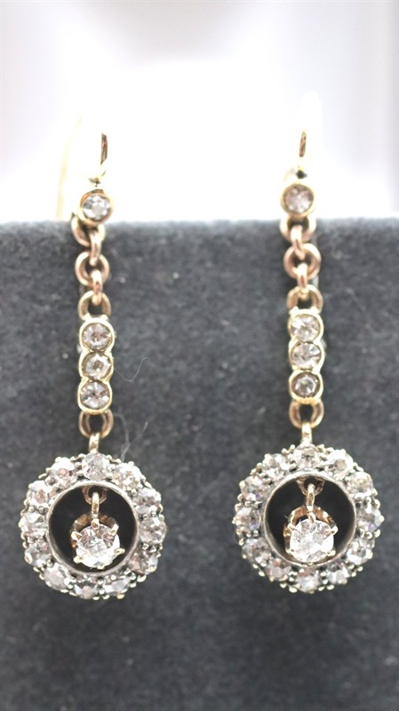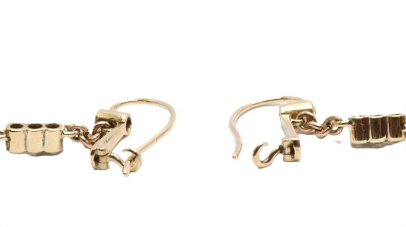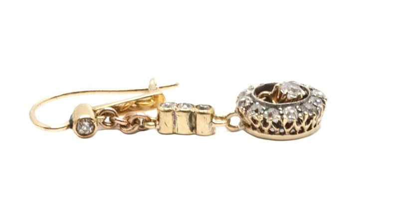 Zlaté náušnice s diamanty. Žluté zlato 333/1000 - 750/1000. Přírodní diamanty - starý brus, kvalita SI1 - I1, barva H - J, celková váha 1,1 ct. Váha náušnic: 4,24 g. Délka náušnic: 3 cm. Osvědčení puncovního úřadu.