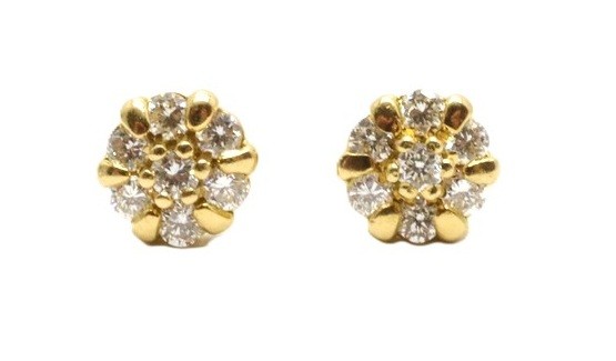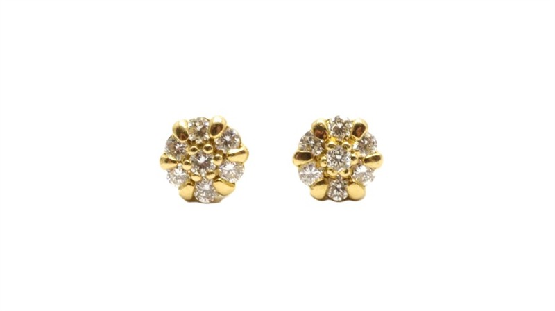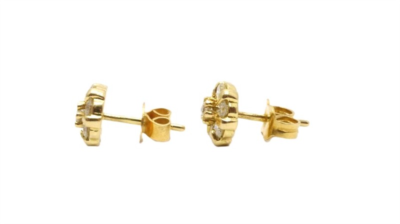 Zlaté náušnice s diamanty. Žluté zlato 750/1000. Přírodní diamanty, kvalita SI1 - SI2, barva G - H, celková váha 0,55 ct. Váha náušnic: 2,15 g. Průměr náušnic: 0,8 cm.