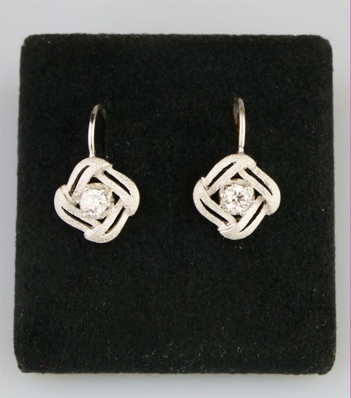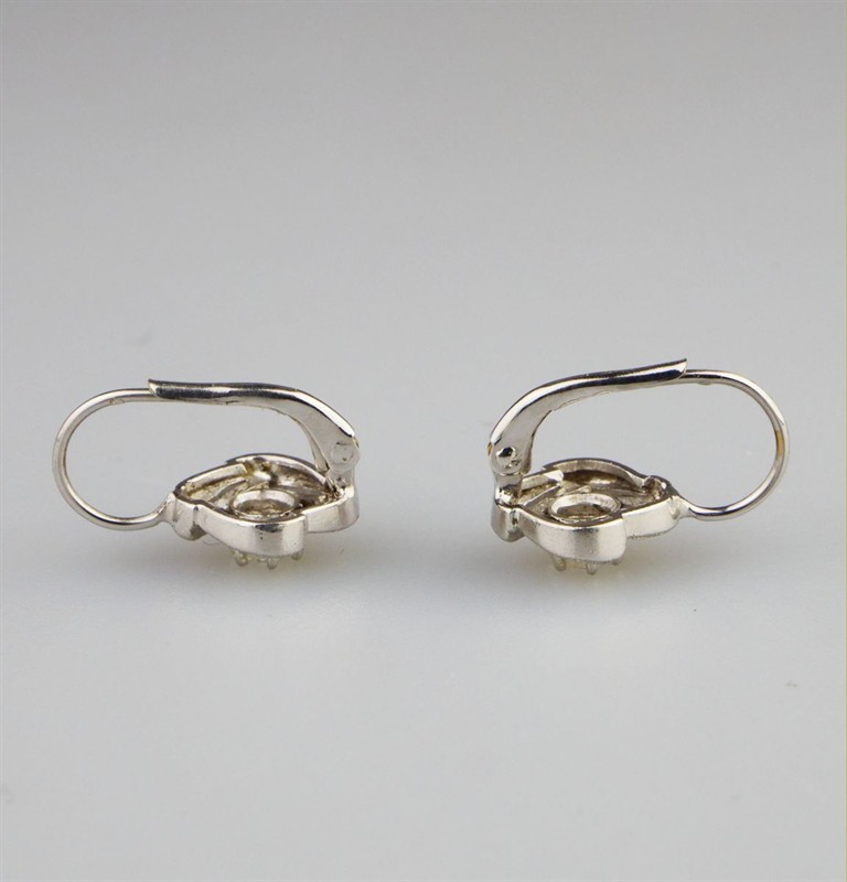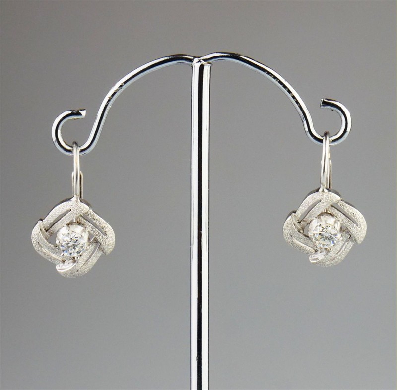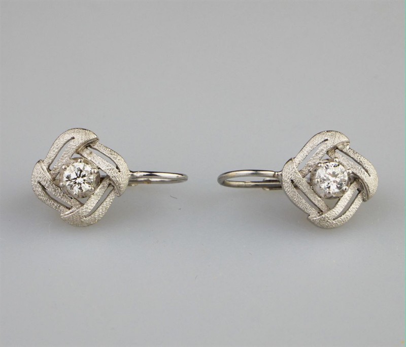 náušnice z bílého zlata s cizelovaným matovaným povrchem se dvěma diamanty briliantového brusu o celkové hmotnosti cca 0,3 ct, Au 3,91 g/750/1000, západní Evropa, kolem r. 2000, pozdější český punc (kohout); rozměry 1,7 x 1,2 x 1,2 cm