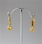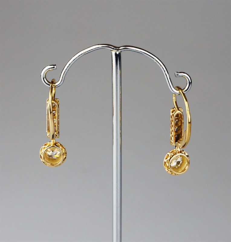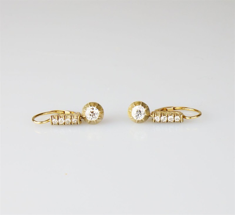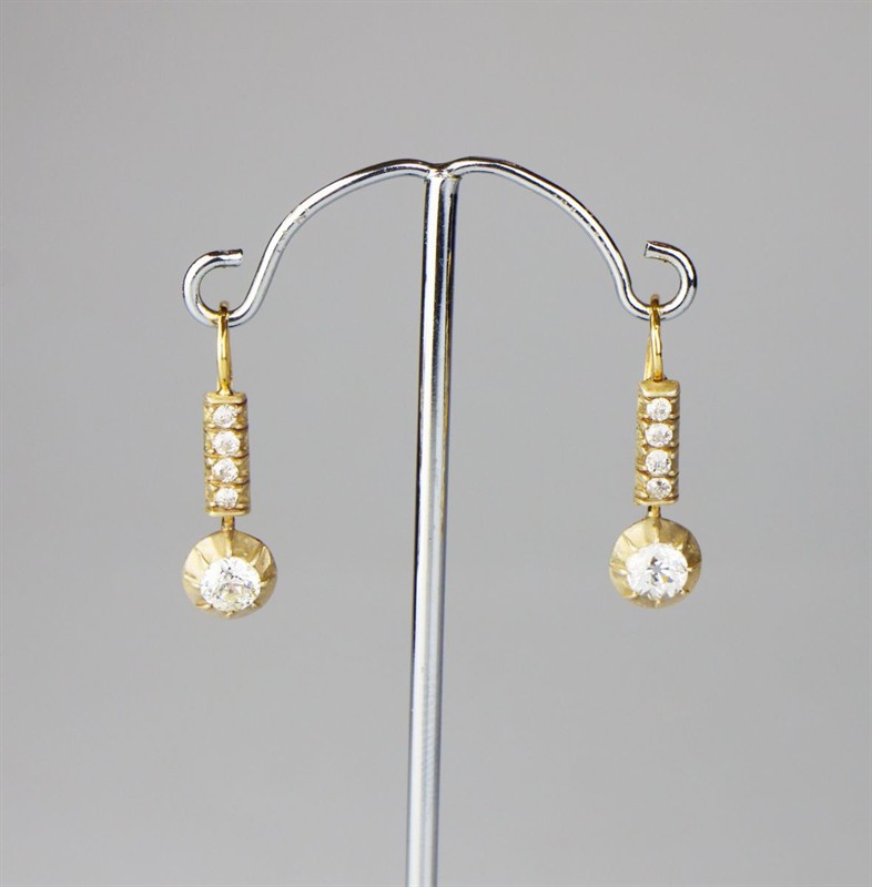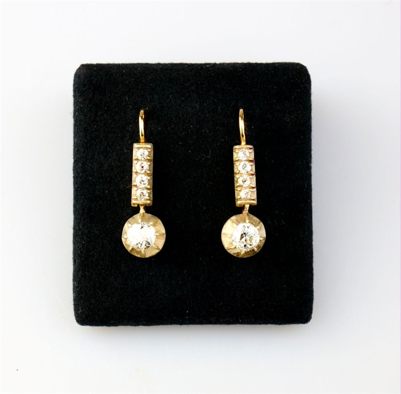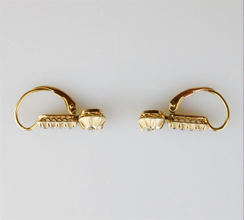 zlaté náušnice s diamanty fasovanými v ryzím stříbře, Au+Ag btto 3,48 g/580+999/1000, dva velké diamanty starého briliantového brusu mají hmotnost cca 0,46 + 0,39 ct, kvalitu P1 a barvuI-J a L-M, celková hmotnost diamantů starého briliantového brusu je cca 1,09 ct, Au btto 3,48 g/580/1000, Rakousko-Uhersko, kolem r. 1915; rozměry 2,55 x 0,75 x 1,18 cm; znalecký posudek, atest Puncovního úřadu