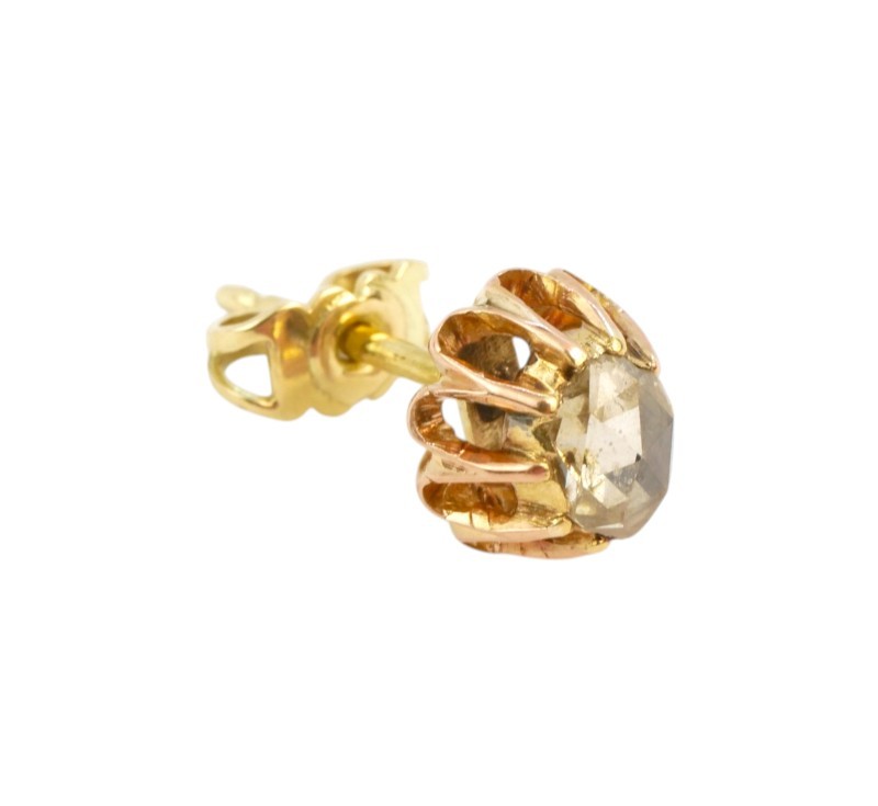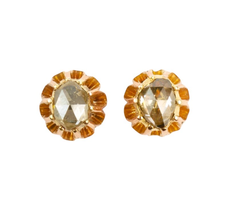 Jemné náušnice ze zlata ryzosti 585/1000 (punc labuť) zdobené diamantovými routami. Rozměry 9 x 8 mm. Celková hmotnost 2,64 g.