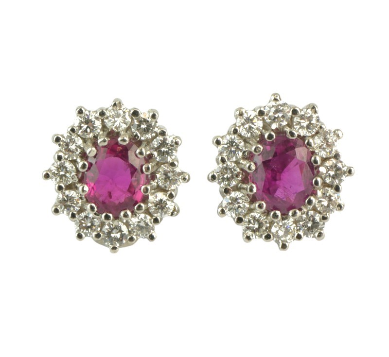 Elegantní, zářivé náušnice s centrálním přírodním rubínem oválného smíšeného brusu o váze 0,45 ct, celkové váze tedy 0,90 ct, původem pravděpodobně z Thajska, rámováno přírodními diamanty kulatého briliantového brusu o celkové váze 0,60 ct (0,025 ct - 24 ks), kvalita velmi dobrá. Pečlivě fasováno krapnami v jemně stavěné hlavici. Precizní západoevropská zlatnická práce ze 70. až 80. let 20. století. Zhotoveno z bílého 14 karátového zlata, tj. o ryzosti 585/1000; nově opatřeno puncem Z-58 (labuť 4) na dřících, ryzostní číslo a další značení na puzetách. Hmotnost 3,00 g, délka hlavice 10 mm, šířka 9 mm. Puzetové zapínání v pořádku (jedna nepůvodní), ve velmi zachovalém stavu, odborně vyčištěno a vyleštěno zlatníkem. Součástí odborný posudek.