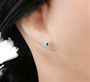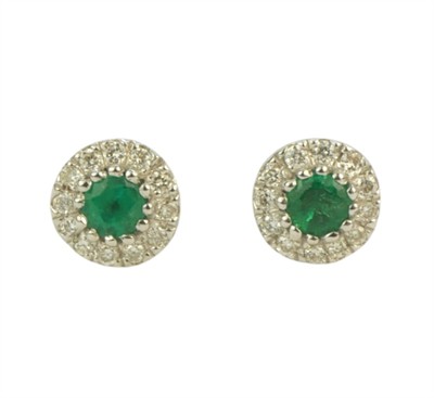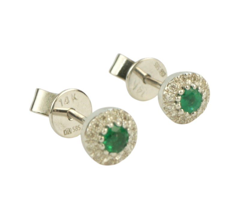 Náušnice z bílého zlata ryzosti 585/1000 zdobené diamanty o celkové hmotnosti 0,06 ct a smaragdy o hmotnosti 0,10 ct. Celková hmotnost obou náušnic je 1,16 g. Průměr 0,5 cm.