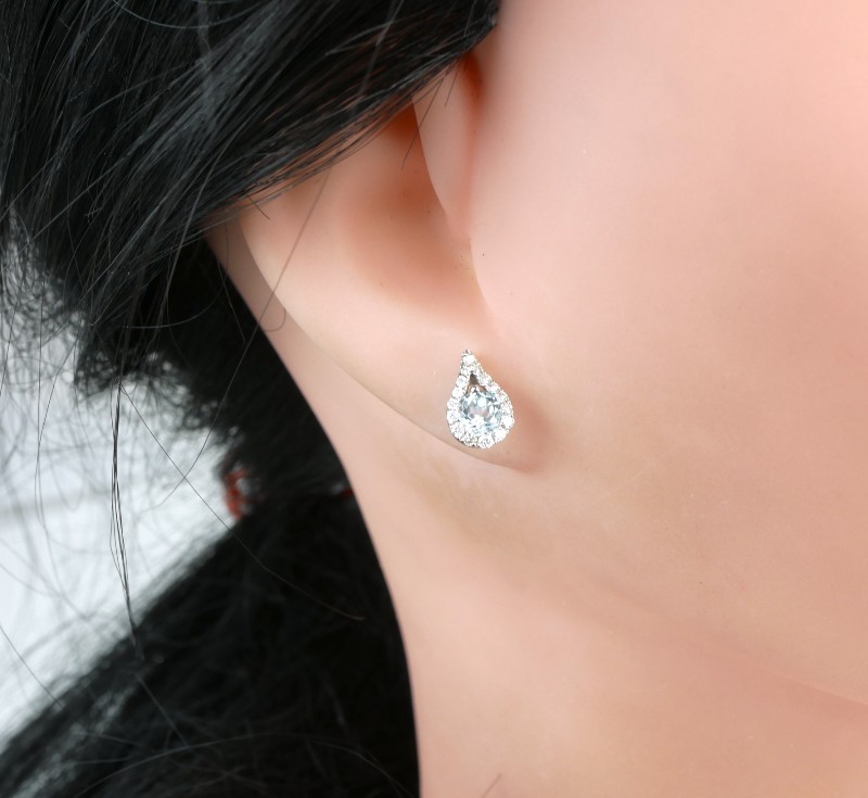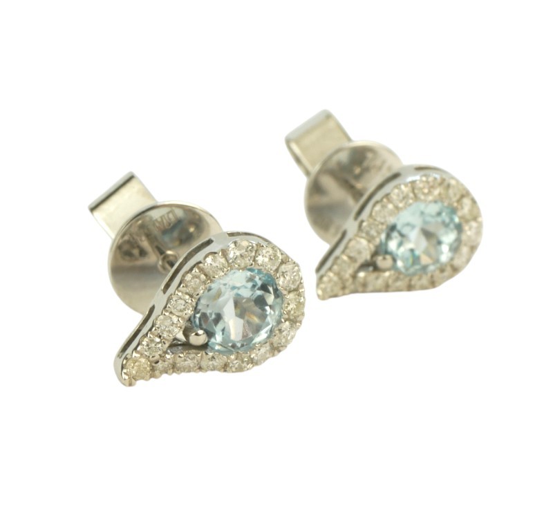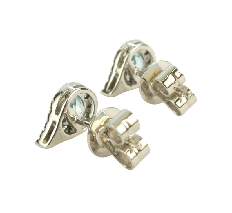 Náušnice z bílého zlata ryzosti 585/1000 zdobené diamanty o celkové hmotnosti 0,20 ct a topazy o hmotnosti 0,40 ct. Celková hmotnost obou náušnic je 1,72 g. Rozměry 0,9 x 0,7 cm.