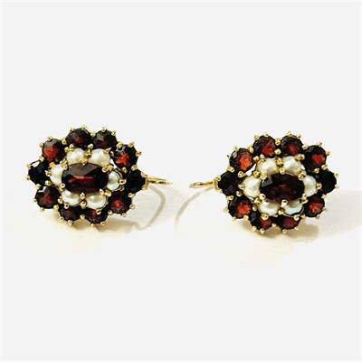 Honosné náušnice s hlavicí připomínající oválný květ, ve středu a při okraji osazeno přírodními granáty kulatého hvězdicového brusu, kontrastní kombinace s přírodními bílo-šedými perlami (půlperly), fasováno krapnami. Kvalitní německá zlatnická práce z 50. let 20. století. Zhotoveno z narůžovělého žlutého 8 karátového zlata, tj. o ryzosti 333/1000; vyhotoveno osvědčení puncovního úřadu, ryzostní číslo u zapínání. Hmotnost 5,55 g, celková délka 19 mm, délka hlavice 16 mm, šířka 14 mm. Klapkové zapínání v pořádku, ve velmi zachovalém stavu, odborně vyčištěno a vyleštěno zlatníkem.