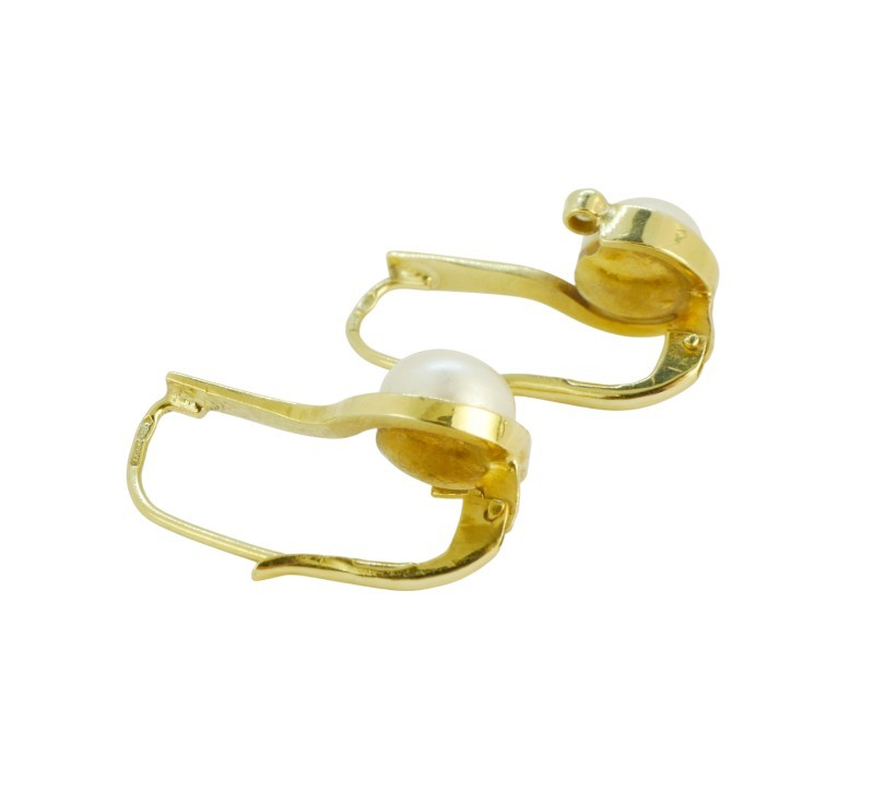 Náušnice ze žlutého zlata ryzosti 585/1000 s perlami. Celková hmotnost obou náušnic je 4,0 g. Délka náušnice je 2 cm.