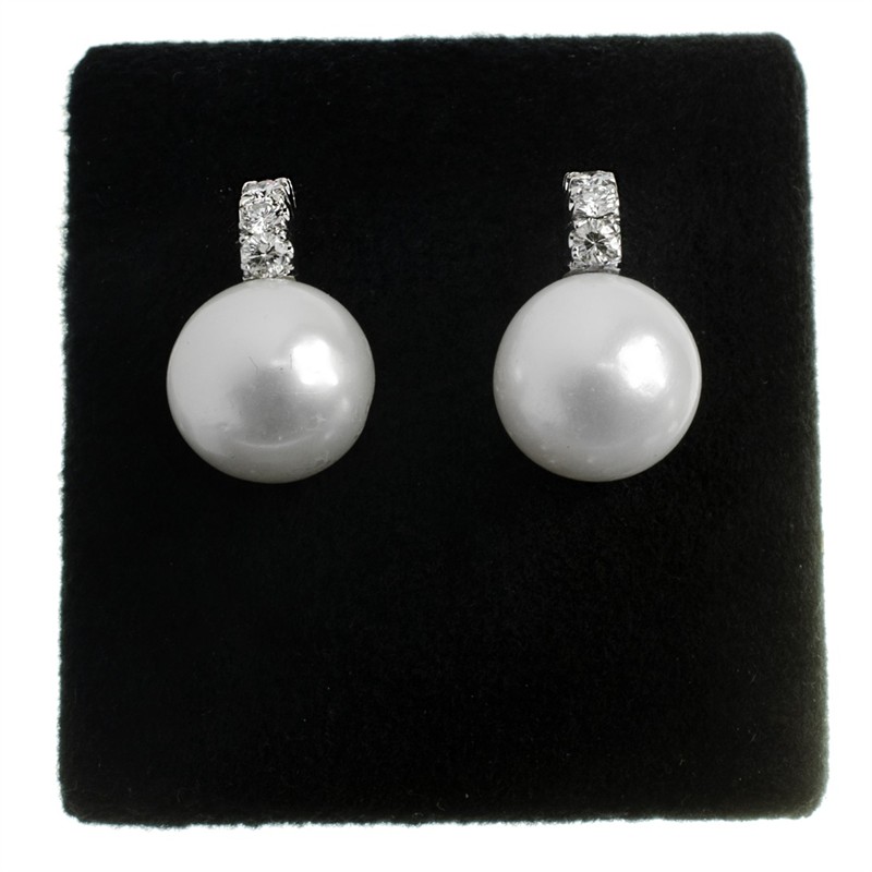 Náušnice z bílého zlata zdobené mořskými perlami a brilianty. Au 750/1000, hmotnost: 6,95g. Čechy, 2. polovina 20. století. Délka 1,6cm, průměr perly: 1 cm.