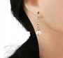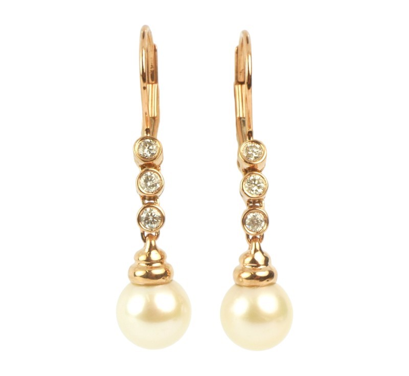 Visací náušnice z růžového zlata ryzosti 585/1000 jsou osazeny perlami a diamanty briliantového brusu o celkové hmotnosti 0,24 ct. Celková hmotnost obou náušnic je 3,10 g. Délka náušnice 3,3 cm.