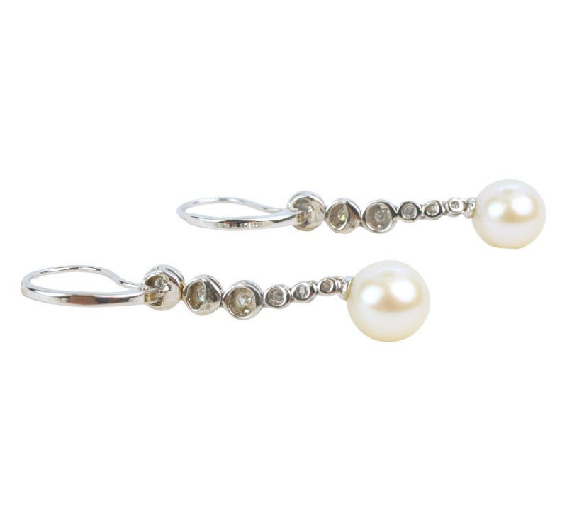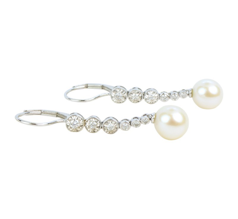 Visací náušnice z bílého zlata ryzosti 585/1000 jsou osazeny perlami a diamanty briliantového brusu o celkové hmotnosti 0,20 ct. Celková hmotnost obou náušnic je 3,08 g. Délka náušnice 3,9 cm.